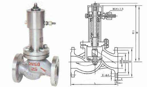 本阀在无气压情况下,阀瓣处于常闭状态,当气泵把压力气输入本阀气缸时,阀瓣开启,当需要关闭阀门或遇有紧急情况时,将压力泄掉即自动关闭。