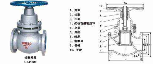 UZ41H柱塞闸阀是由阀体、阀盖、阀杆、柱塞、导向套、密封环、手轮等零件组成。当手轮旋转时,通过阀杆带动柱塞在导向套中上、下往复运动,使柱塞端部斜锥面与阀座面完成阀门的开启与关闭功能。